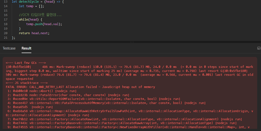 작성하다가 깨달았다. 애초부터 매개변수로 주어진 head는 이미 순환이 적용된 연결리스트다. 그렇기 때문에 부분집합이 셀 수 없을 정도로 많이 나온다.