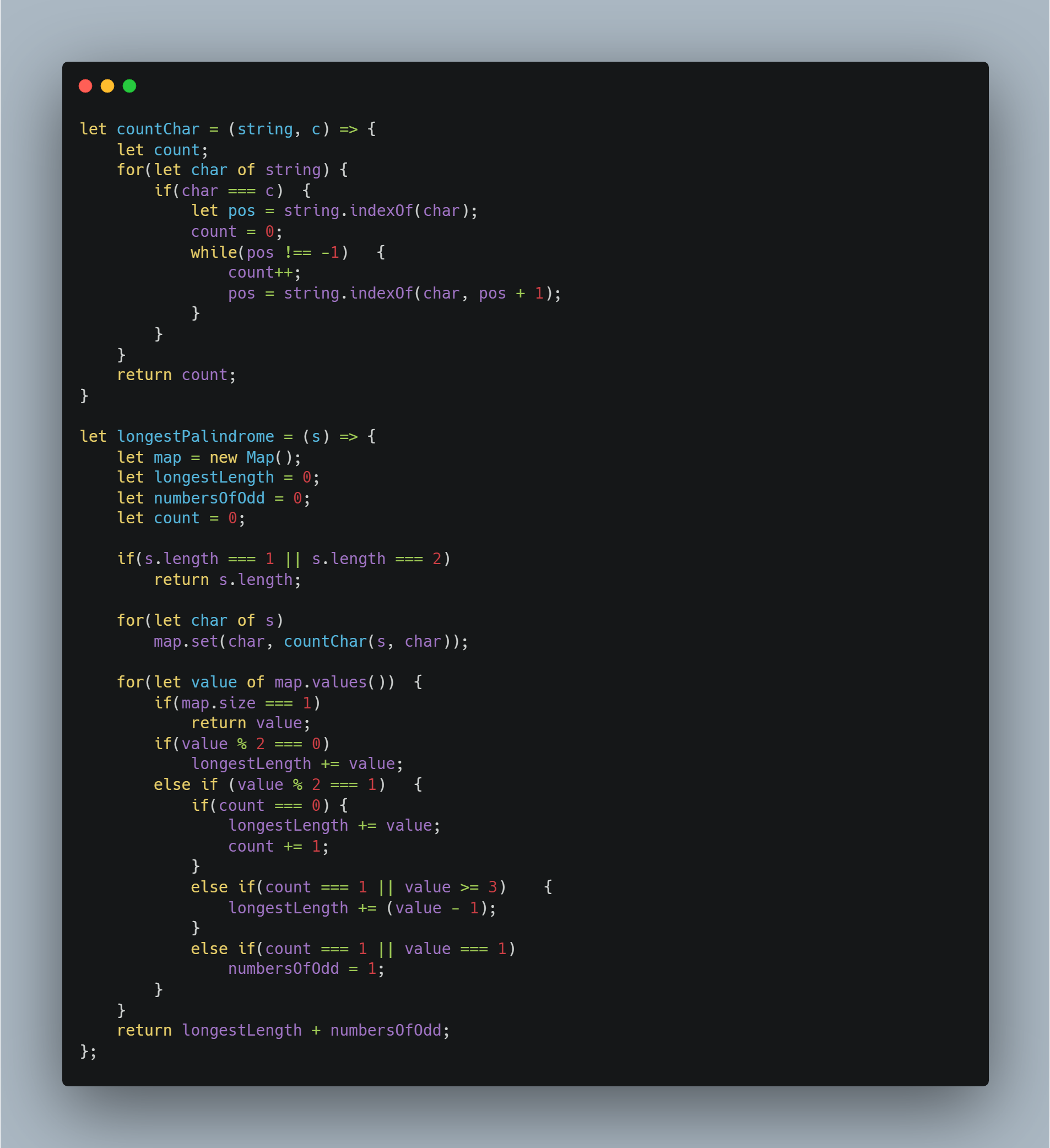 소문자 또는 대문자로 구성된 문자열을 지정할 경우 해당 문자로 작성할 수 있는 가장 긴 palindrome의 길이를 반환합니다.